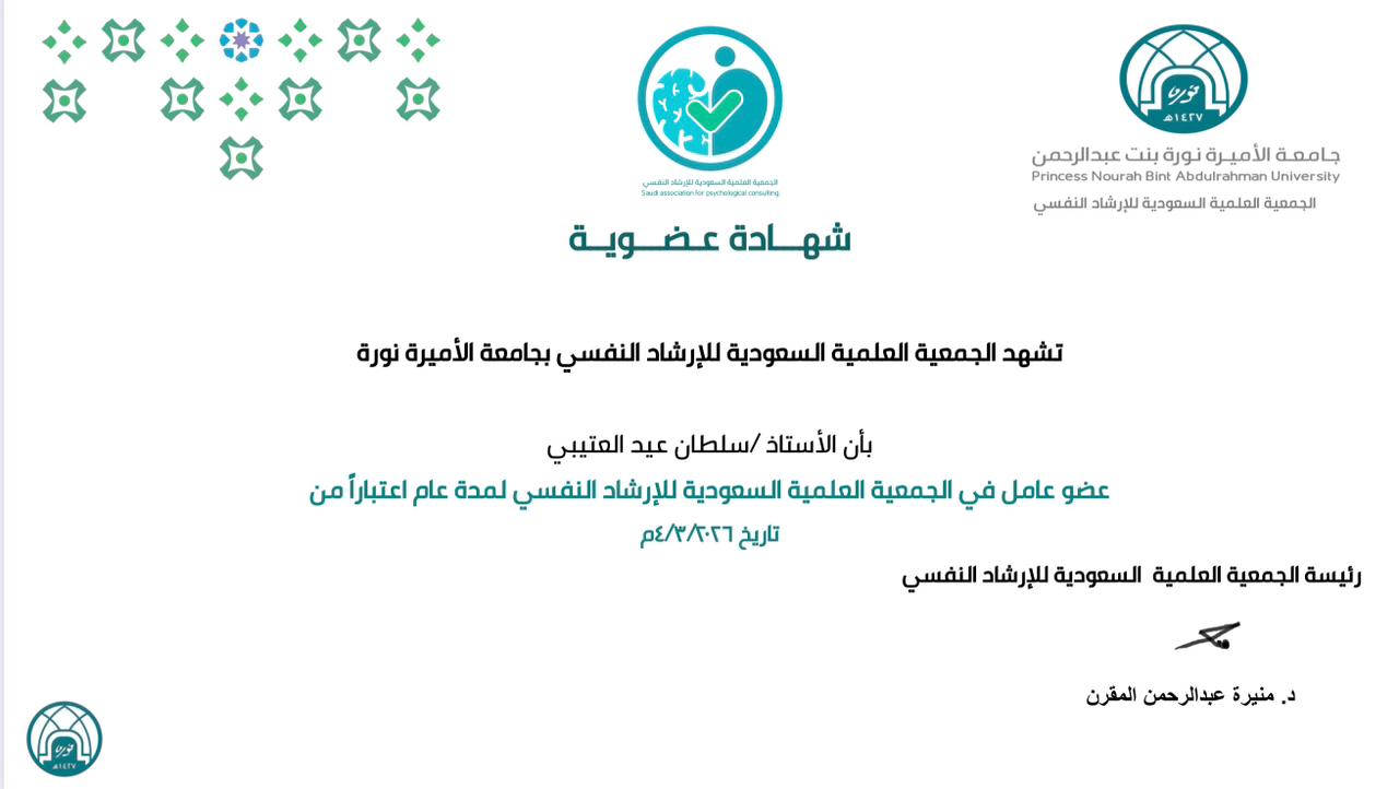 عضو الجمعية السعودية للإرشاد النفسي بجامعة الأميرة نورة بنت عبد الرحمن بالرياض